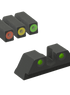 Mepro Hyper-Bright fixed pistol sight features an extremely bright contrasting colored ring front sight. Shooters can select from one of three colors* Green, Yellow or Orange*for the front sight. The tritium is illuminated green to provide low-light and nighttime aiming capabilities. The contrast in colors of the two components helps the shooter focus on the front sight quicker, which is critical in defensive and competitive shooting.
